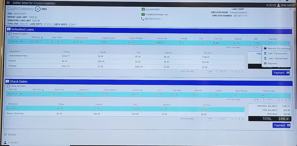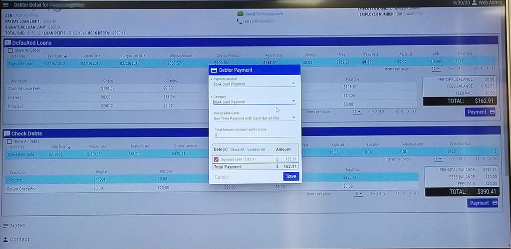 Lendwise Screen 2:Loan Management System (Lendwise) Customer Service View Debtor Payment. Showcasing modal window interactions, for quick contextual action based interactions.