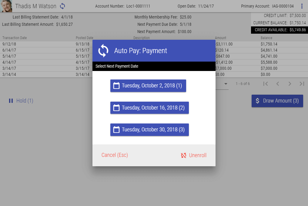 Line of Credit Screen 2:Cashwise (a desktop application) opened Line of Credit (a web application) showcasing Auto Pay Payment modal.